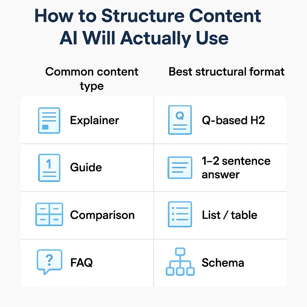 These are the core formatting patterns that help AI tools interpret and reuse your content reliably. Most content fails the AI test, not because it’s wrong, but because it’s unreadable to a model.