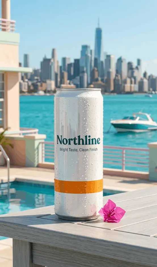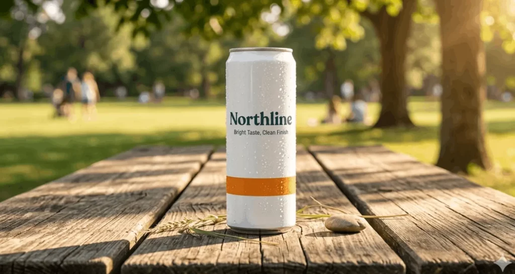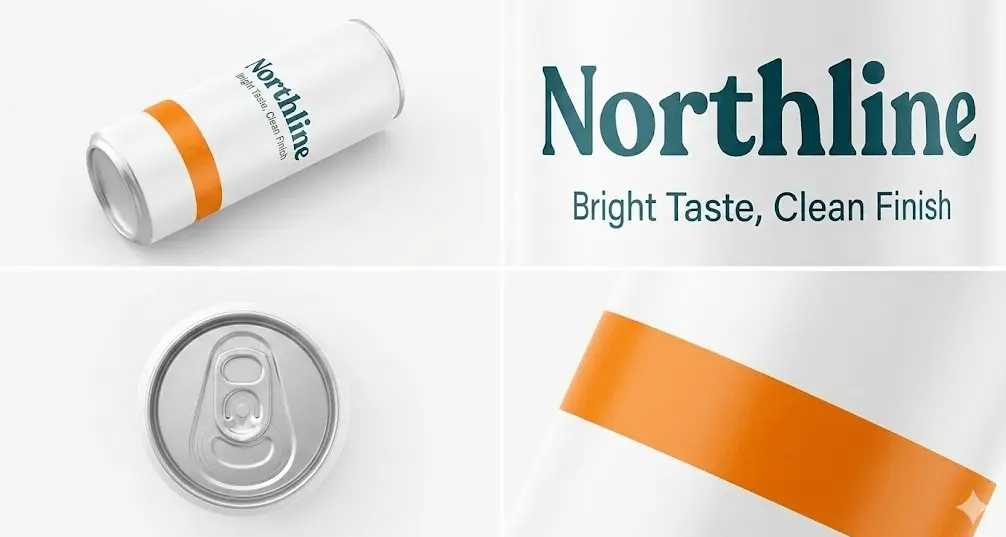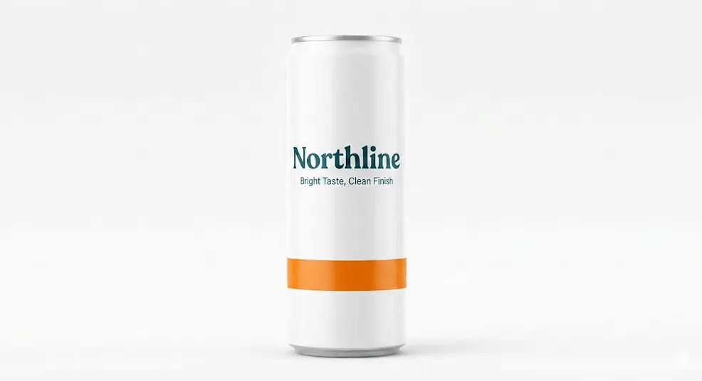 For this example, I created a fake brand called Northline Sparkling Water. The core product is a slim 12-oz can with a white body, deep teal logo, orange flavor stripe, and the tagline Bright Taste, Clean Finish.