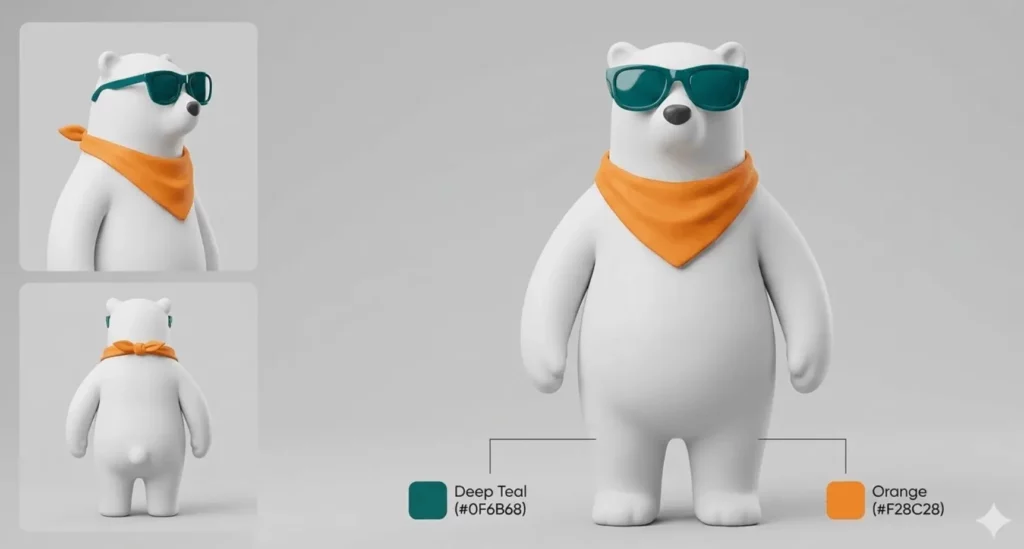 For example, I created this mascot reference image of a bear with sunglasses and the brand colors.
