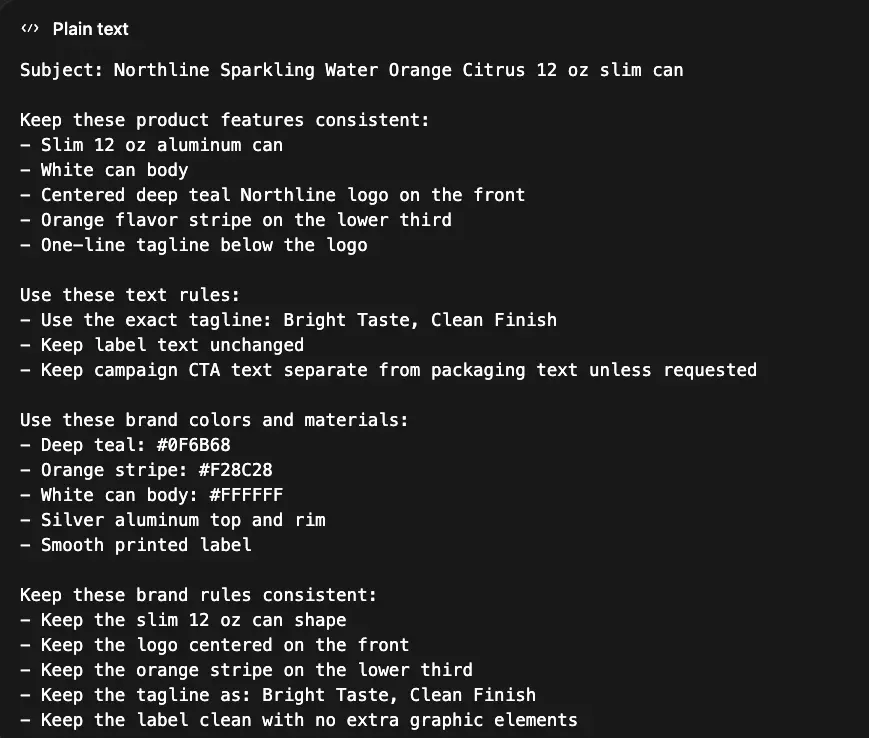 That includes the brand name, product name, tagline, CTA, flavor name, and any packaging copy that must remain unchanged. Use one approved version of each line. Don’t leave wording open to interpretation.