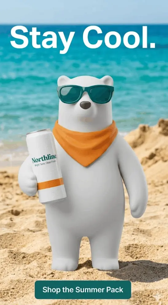 Example: for Northline, I asked it to fix Bright Taste, Clean Finish as the can tagline and Shop the Summer Pack as the ad CTA before building the asset. Then to add the ‘Stay Cool’ text.